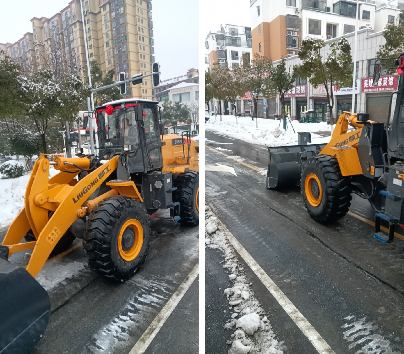 湖北武漢市的“破冰除雪”行動(dòng)中,湖北柳瑞快速響應(yīng),提前部署,對(duì)裝載機(jī)、平地機(jī)等應(yīng)急設(shè)備進(jìn)行養(yǎng)護(hù),準(zhǔn)備了充足的備用品;出動(dòng)柳工820H、856H以及855N裝載機(jī)參與市區(qū)除雪除冰。在武漢市部分街道和孝感市高速公路上,可以看到柳工855N、856N裝載機(jī)和滑移裝載機(jī)、平地機(jī)等設(shè)備忙碌的身影,它們?cè)诘缆飞厦β党_保道路暢通;吊裝融雪劑,降低冰雪對(duì)道路影響。