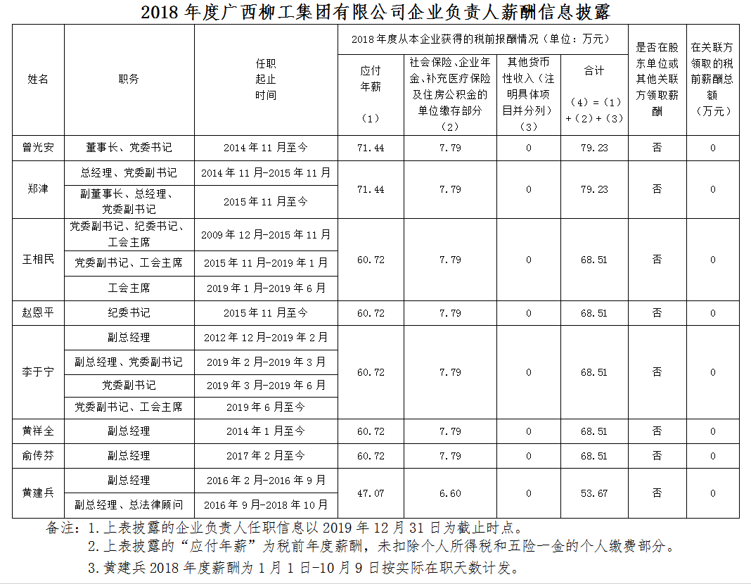 2018年度廣西柳工集團(tuán)有限公司企業(yè)負(fù)責(zé)人薪酬信息披露