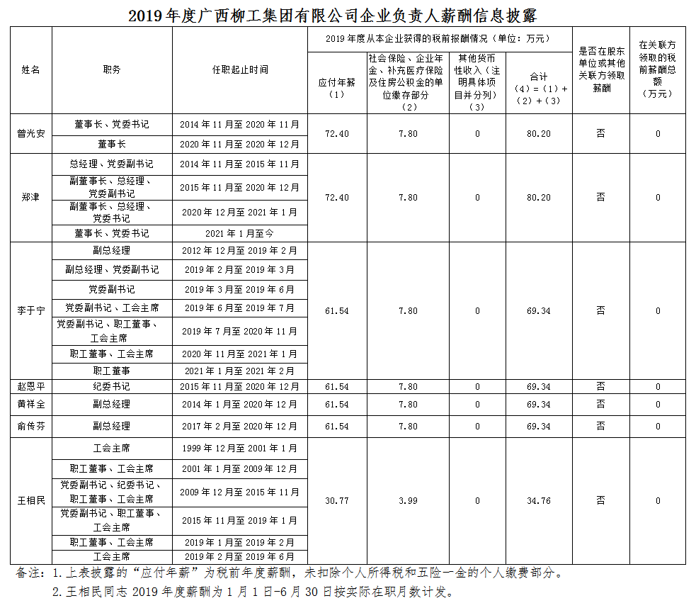 2019年度廣西柳工集團有限公司企業(yè)負責(zé)人薪酬信息披露