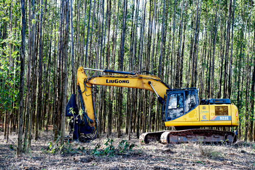 汽車飛馳在莫吉瓜蘇市平坦筆直的公路上,一路美景盡收,但進(jìn)入林區(qū)后道路變得蜿蜒崎嶇,30多公里的路程,我們卻走了一個(gè)半小時(shí)。穿過(guò)大片大片整齊的桉樹林,在一片已經(jīng)砍伐完成的木材旁,只見柳工CLG922E挖掘機(jī)正在矯健地?fù)]舞著長(zhǎng)臂進(jìn)行裝車。不到十分鐘的時(shí)間,一大卡車木材便在柳工CLG922E挖掘機(jī)這個(gè)得力助手的幫助下裝運(yùn)完畢。