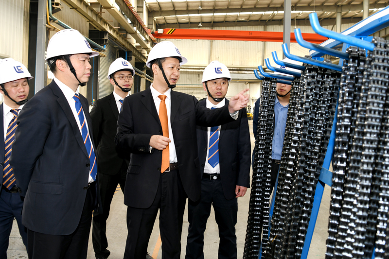 王太平(左一)陪同黃海波(左二)在生產(chǎn)車間檢查工作