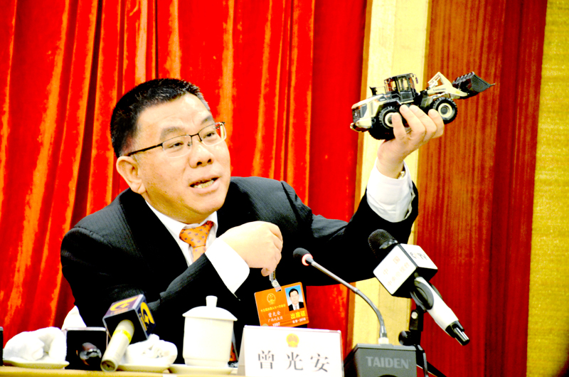 曾光安在廣西代表團媒體見面會上展示柳工裝載機模型